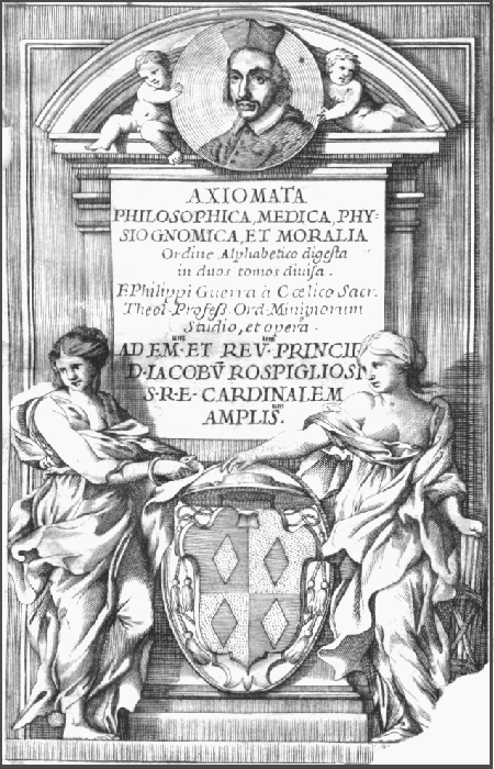 [frontespizio:] AXIOMATA / PHILOSOPHICA, / E T / M E D I C A / Repsectiuè Ordine Alphabetico digesta / FR. PHILIPPI GVERRA À COELICO / Conc. & S. Theolog. Profess. Ord. Minorum / Studio, & Opera / TOMVS PRIMVS / AD EMINENTISS. ET REV. PRINCIPEM / D. IACOBVM / ROSPIGLIOSIVM / S.R.E. CARD. AMPLISSIMVM. / [fregio] / R O M Æ, / Typis Iacobi Dragondelli. M. DC. LXVII. / [linea] / SVPERORVM PERMISSV. [l'esemplare utilizzato è di proprietà privata]